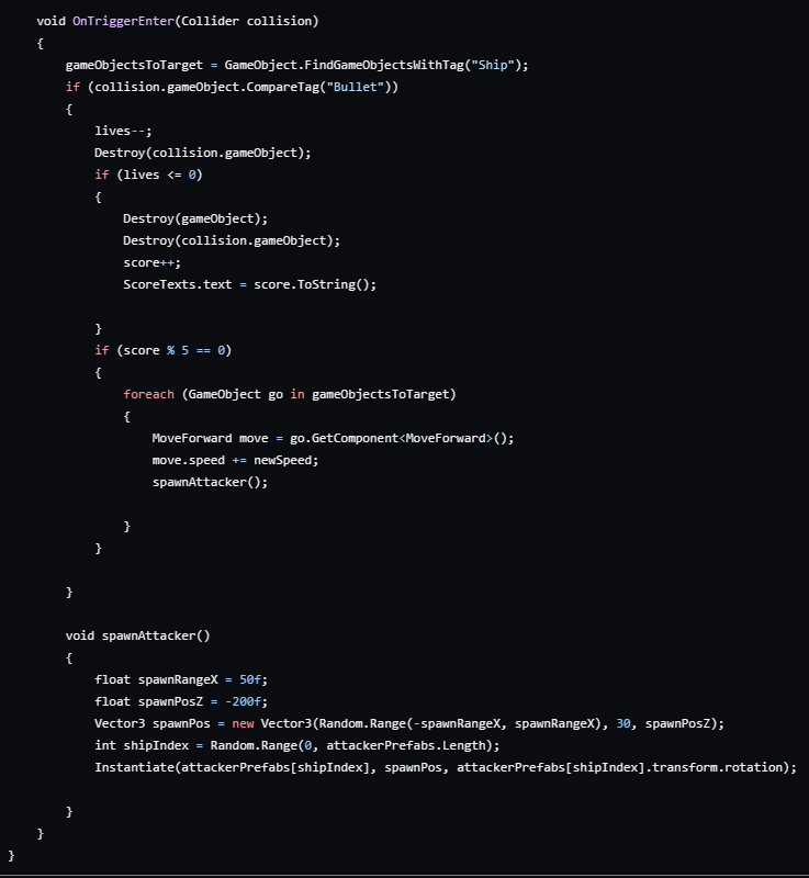 I chose to showcase this code because it took me a while to figure out how to make the ships move progressivly faster as the game moves on so I was very happy once I figured it out.